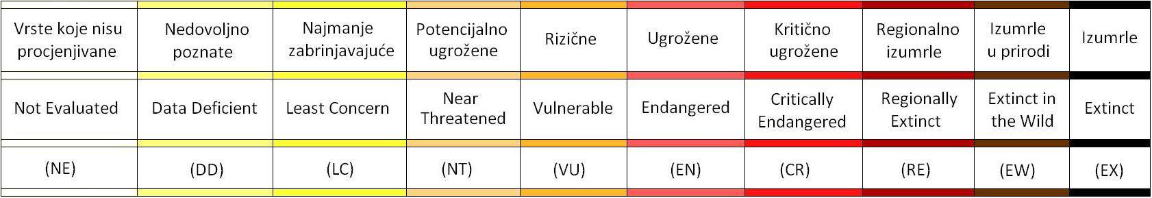 ugrožene vrste (rizične VU, ugrožene EN, kritično ugrožene vrste CR), kojima se pribrajaju i nedovoljno poznate vjerojatno ugrožene vrste (DD), za koje nedostaje podataka na temelju kojih bi se mogla utvrditi njihova stvarna kategorija ugroženosti;